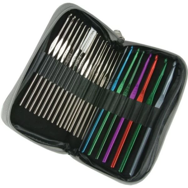 Boye CrochetMaster Set – Boye-Master Crochet Set. This set comes in a durable vinyl case zippered on three sides to lay open flat. Set contains one of each: steel: 00 (3.5mm), 0 (3.25mm), 1 (2.75mm), 2 (2.5mm), 3 (2.10mm), 4 (2.00mm), 5 (1.9mm), 6 (1.8mm), 7 (1.65mm), 8 (1.5mm), 9 (1.4mm), 10 (1.3mm), 11 (1.1mm), 12 (1.0mm), 13 (.85mm), and 14 (.75mm), and Aluminum: D-3 (3.25mm), E-4 (3.50mm), F-5 (3.75mm), G-6 (4.25mm), H-8 (5.0mm), I-9 (5.5mm), J-10 (6.0mm), K-10.5 (6.5mm). Case measures approximately 6x4x1inch closed and is made of durable canvas.