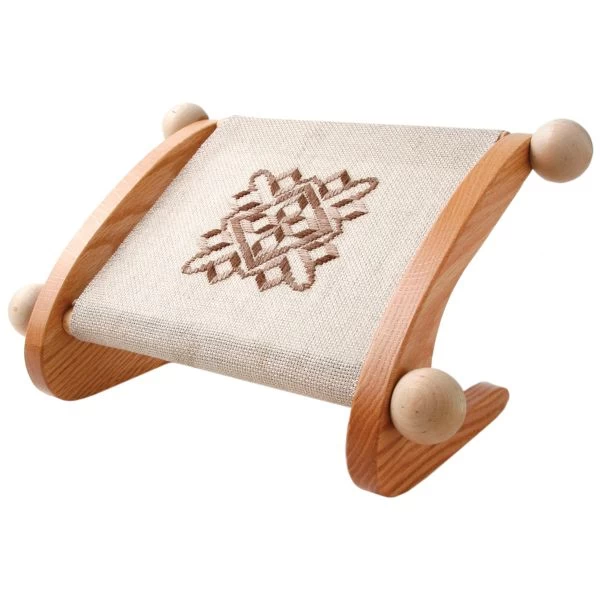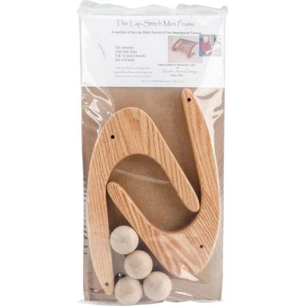 Cabranmary Woods Dutch Treat Lap-Stitch Mini Frame – A member of the lap-stitch family of fine needlework frames. The Mini Frame is designed for the small sized needlepoint, cross stitch, crewel, embroidery, punch needle and many other stitchery projects. The frame comes with 9in and 12in x 3/4in dowels, a set of four knobs and solid oak side bars. The unique mounting system allows for easy on and off of projects with no messy glues, tape residue or snags. This frame is perfect for mounting fabrics no shorter than 10 inches with widths from 3in to 12in. Handcrafted in the USA.