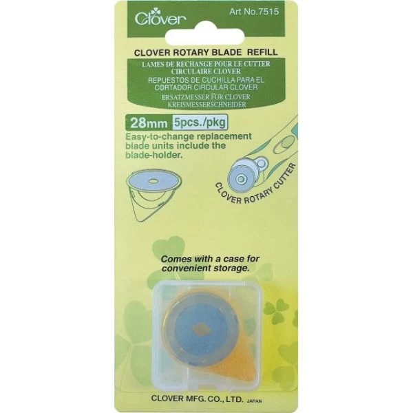Clover Rotary Blade Refill 28mm 5/Pkg – CLOVER-Cuts fabric beautifully with just the right amount of blade exposed, whether held upright or at an angle. Convenient for both left and right handers. Five blades per package.