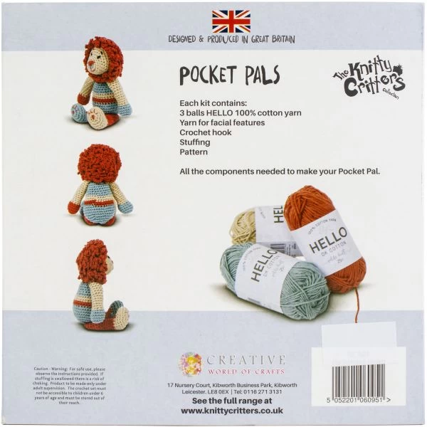 Creative Expressions Knitty Critters Pocket Pal Crochet Kit – This crochet kit designed by Mandy Cameron has all that you need tocreate this fun knitty critter! This package contains (3) 25gramballs of HELLO 100% cotton yarn, extra yarn for facial features, acrochet hook, stuffing and a pattern. Care Instructions: Machine washand dry. Design: Lucas Lion. Imported.