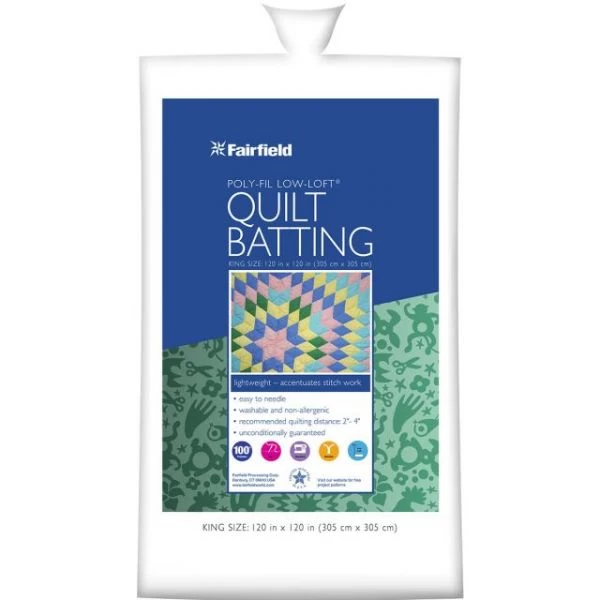 Fairfield Low-Loft Bonded Polyester Batting – FAIRFIELD-Low-Loft Bonded Polyester Batting: Large King Size. Create a soft quilt with this easy to needle and non-allergenic needle extra-loft bonded polyester. Perfect for hand or machine quilting. The recommended quilting distance is between two and four inches. This package contains 120×120 inches of large king size polyester batting. Made in USA.