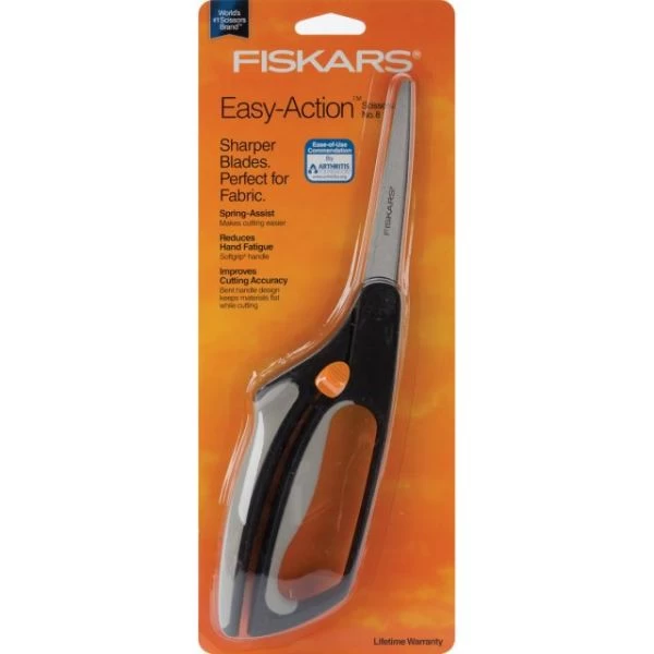 Fiskars Easy Action Bent Scissors 10″ – These scissors feature an adjustable pivot screw, oversized cushion grip handles which are specially designed to reduce discomfort in the thumb and fingers. A spring gently opens the scissor after each cut making this scissor ideal for heavy users and for people experiencing weakness in their hands. Perfect for right or left hand use! This 5×12 inch package contains one 10 inch shears. WARNING: Cut Hazard, Sharp Blade. Contact may result in injury. Always keep blades away from fingers and body. Handle with Care. Keep out of reach of children. Imported.
