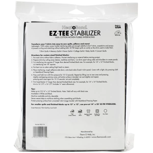 HeatnBond EZ-TEE Woven Fusbile Stabilizer – HeatnBond EZ-TEE Woven Fusible Stabilizer. Transform your T-shirts into easy-to-sew quilts, pillows and more! Lightweight, 100% cotton woven fusible interfacing adds just enough stability to knit T-shirts, sweatshirts and jerseys to prevent curling and stretching without adding bulk. EZ<BR>-TEE keeps quilts as comfy as the shirts used to make them. Made in USA.