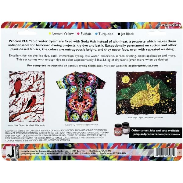 Jacquard Procion MX 4-Color Dye Set W/Soda Ash – JACQUARD-Procion MX Dye Four Color Set. Procion MX is the most versatile and popular of dyes. It can be used for tie dye, batik, immersion dyeing, and direct application. The colors in this set are completely intermixable to achieve any color desired. This set contains 2/3 ounce each of Lemon Yellow, Fuchsia, Turquoise, and Jet Black, and 1 pound of Soda Ash Fixer. For use in cold water on natural fibers. Made in USA.