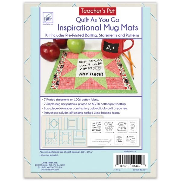 June Tailor Quilt As You Go Inspirational Mug Mats Kit – Automatically quilt as you sew! This package contains seven printed statements on 100% cotton fabric, seven simple mug mat patterns on 80% cotton/20% polyester batting and patterns. Approximate finished size: 8.5×10.5 inches. Made in USA.