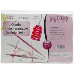 Knitter’s Pride-Comby Interchangeable Sampler Set 1 – Knitter’s Pride-Comby Interchangeable Sampler Set 1. Perfect for any knitter! This package contains one pair of Dreamz US6/4mm needles, one pair of Cubics Rose US7/4.5mm needles, one pair of Nova Platina US8/5mm needles, one 24 inch long cord, one 40 inch long cord, four end caps and two cord keys within one 5-1/2×7-3/4 inch vinyl case. Imported.