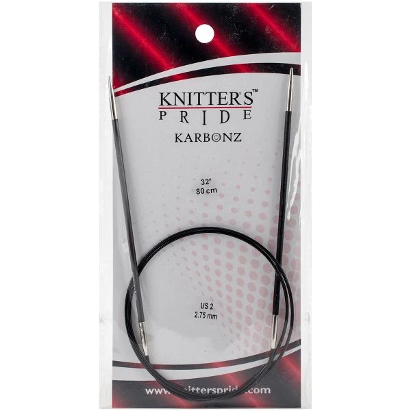 Knitter’s Pride-Karbonz Fixed Circular Needles 32″ – Knitter’s Pride-Karbonz Fixed Circular Needles. Karbonz needles are made from high-tech carbon fiber with tips in nickel plated brass. The light bodied carbon fiber & sharp brass tips is guaranteed to provide an unparalleled knitting experience. Ideal for all types of yarns and for every project. A smooth join ensures easy glide & no snagging. Needles are easy to store and have a resilient flexible cord that lays flat with no kink or twist. This package contains one pair of circular needles with a 32 inch cord. Comes in a variety of sizes. Each sold separately. Imported.