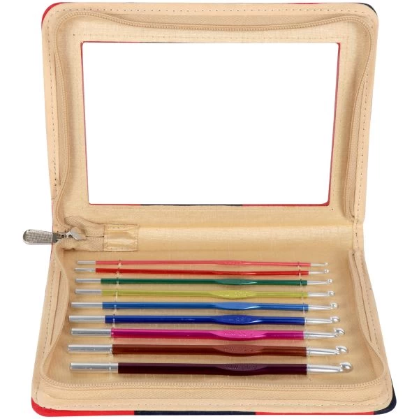 Knitter’s Pride-Zing Single Ended Crochet Hook Set – Knitter’s Pride-Zing Single Ended Crochet Hook. In a spectrum of colors so bright and lively that it takes away ones breath! Shiny silver tips for ease of crocheting with any color. Perfectly shaped hooks to crochet easily. Lustrous metallic shades, specific to sizes. Perfectly smooth surface. Very light on hands. Packaged in a red and blue fabric case. Sizes: C/2.75mm, D/3.25mm, E/3.50mm, F/3.75mm, G/4mm, 7/4.5mm, H/5mm,I/5.5mm, J/6mm. Imported.