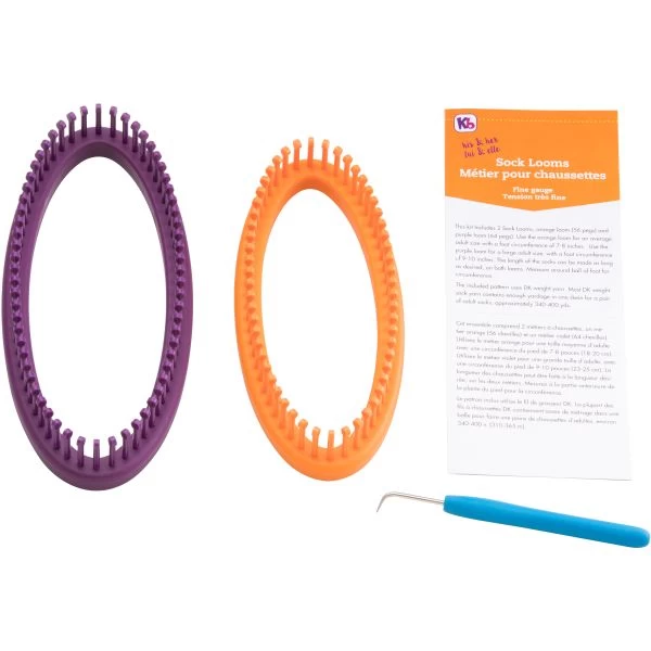 Knitting Board Sock Loom 8″X3.5″ 2/Pkg – Sock Knitting in fine gauge for adult men and women sizes. This 3.75x8x3 inch package contains one medium loom, one large loom, one loom knit hook and instructions to make two size socks. Imported.