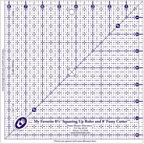 Marti Michell Squaring Up Ruler 8.5″ – This ruler features a shadow that follows each line and turns a corner to make it very easy to see squares, numbering out from one corner on two sides and every line has spaces so you can align the cut edges of the fabric with the line, not on one or the other side of the line. This package contains one 8.5 inch squaring up ruler. Made in USA.