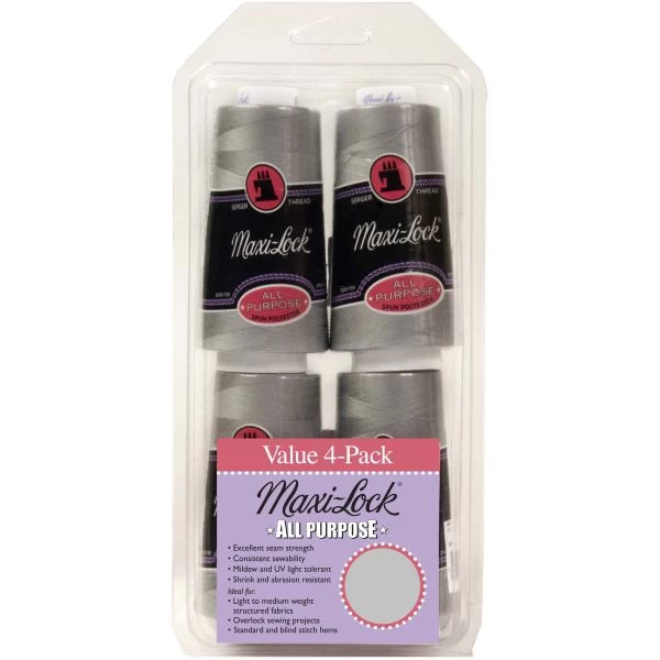 Maxi-Lock All Purpose Value Pack 4/Pkg – American & Efird-Maxi Lock All Purpose Value Pack. Ideal for light to medium weight structured fabrics, overlock sewing projects and standard & blind stitch hems. This package contains four 3000 yard spools of all purpose spun polyester. Comes in a variety of assorted colors. Each sold separately. Imported.