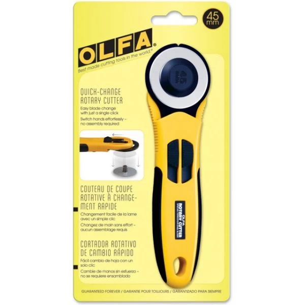 OLFA Quick-Change Rotary Cutter w/Dual Blade Guard 45mm – The OLFA 45mm Quick-Change Rotary Cutter is the perfect addition to any craft space. Quality design and construction make this the perfect tool for projects big and small. Whether you are a quilter, garment sewer, cosplay artist, or general crafter the OLFA 45mm rotary cutter is great for cutting a variety of materials such as fleece, felt, cotton, wool, foam, among others. The quick-change blade feature makes blade changes a snap. The contoured handle allows for comfortable cutting. This package contains one 45mm rotary cutter and 45mm rotary blade. RTY-2/NS, 1079060. WARNING: This product can expose you to chemicals including Di(2ethylhexyl)phthalate (DEHP), known to the State of California to cause cancer, birth defects or other reproductive harm. For more information go to www.P65Warnings.ca.gov. Imported.
