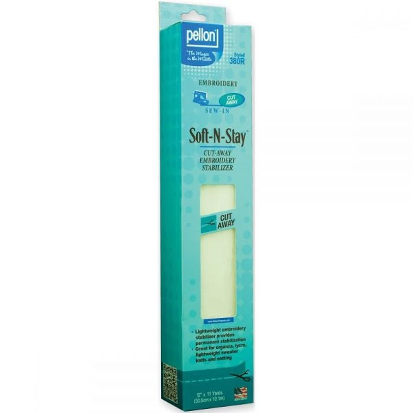 Pellon Soft-Stay Cut Away Embroidery Stabilizer – PELLON: Soft-N-Stay Embroidery Stabilizer. This lightweight embroidery stabilizer is great for use on organza, lycra, lightweight sweater knits, and netting. It adds permanent body and support to lightweight knits and woven fabrics and offers stretch resistance that eliminates the pulling of embroidery designs. Soft- N-Stay is soft to the touch and provides permanent stability by remaining with the fabric through wearing and laundering. This package contains 11 yards of 12-inch-wide stabilizer. 100% nylon. Acid free. Made in USA.