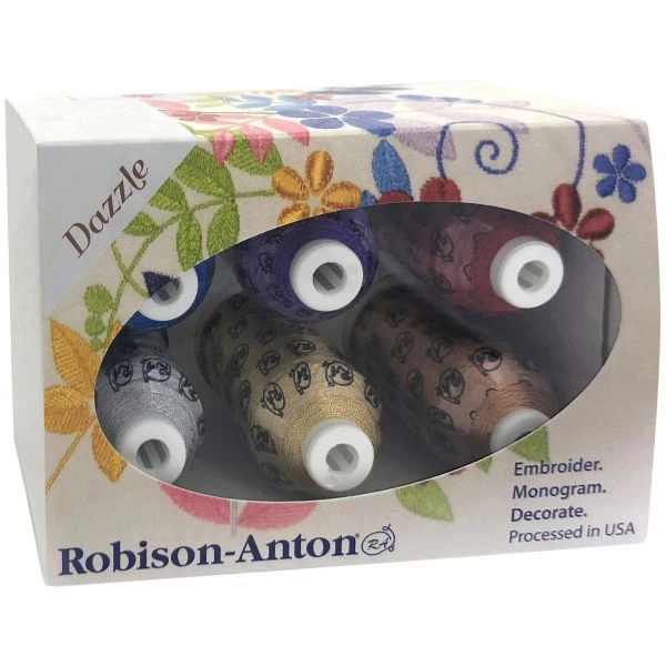 Robison-Anton Metallic Thread Set – 6 Spools – Premium metallic thread with beautiful a shimmer. Strong, soft, and smooth. Ideal for embroidery, monogramming, decorative stitching, and quilting. Thread set has basic metallic colors, making it a great gift, or store giveaway. This package contains six (6) 1000 yard spools of 40wt metallic thread. Imported.