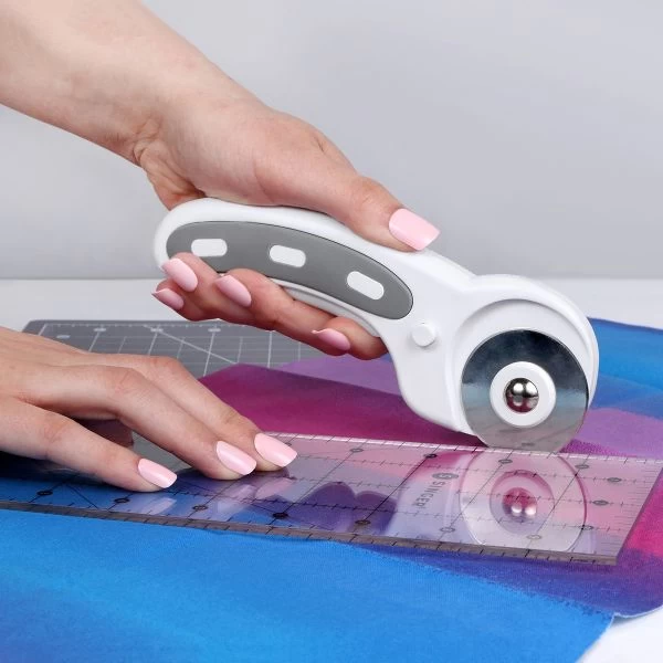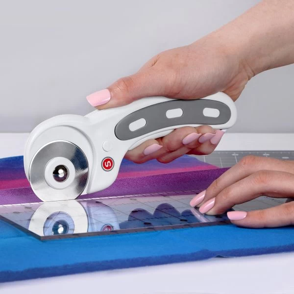 SINGER Modern Maker Lock ‘N Roll Rotary Cutter 45mm – Easily cuts through multiple layers. Ergonomic handle with comfort grip. Squeeze trigger controls blade guard for added safety. Safety button locks blade open or closed. Easy blade replacement. Right- or left-handed use. Uses standard 45mm replacement blades. This package contains one rotary cutter and 45mm blade. Imported.