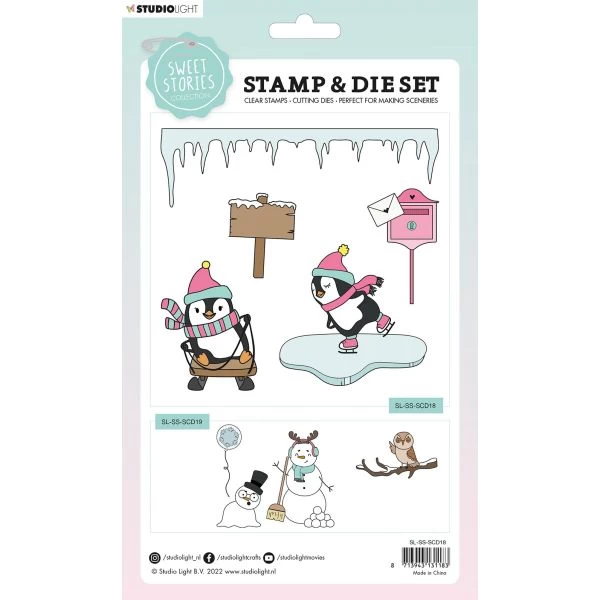Studio Light Sweet Stories Stamp & Die Set – This die and stamp set is a great addition to your craft collection. Perfect for cards, scrapbook pages, gift tags, journals and more! Stamps will add wonderful images or phrases to your papercraft projects. These clear stamps peel off their backing and stick to any acrylic block (sold separately) making for easy stamping. Simply apply your favorite ink and stamp crisp clear images! Dies are great for adding dimension to your projects. The dies are compatible with most leading die cutting machines (sold separately). This package contains one Studio Light Sweet Stories Stamp & Die Set, Nr. 18, Penguin, 18 pieces. Imported.