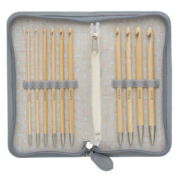 Tulip Carry T Interchangeable Bamboo Tunisian Hook Set – The set comes with a new color case! Rotary cable join prevents twisting. Unique system makes tightening and unscrewing hooks easy and requires no tools. This package contains ten bamboo hooks (Sizes E-4/3.50mm, G-6/4.00mm, 7/4.50mm, H-8/5.00mm, I-9/5.50mm, J-10/6.00mm, K-10.5/6.50mm, 7.00mm, L-11/8.00mm, M-13/9.00mm), 3 cables (24in/60cm, 32in/80cm, 40in/100cm), 1 adapter, 2 stoppers, 2 tapestry needles, 1 gauge with built-in yarn cutter, and 1 case. Imported.