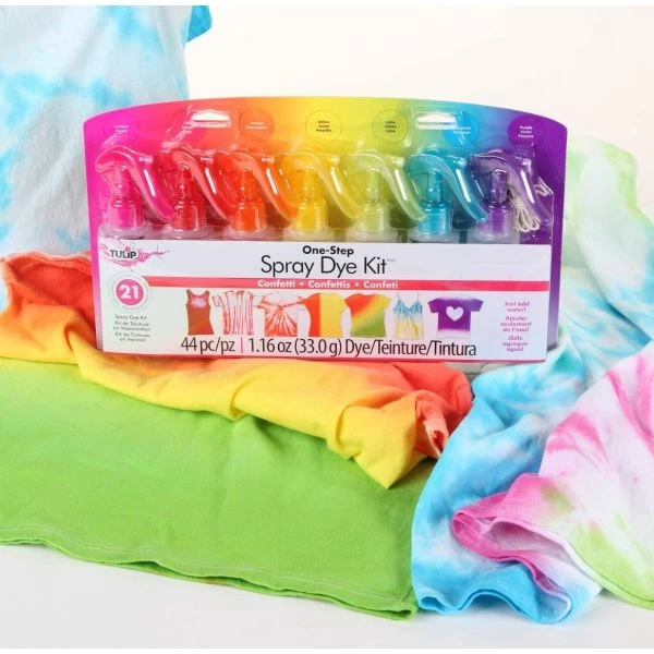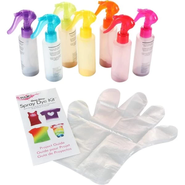 Tulip One-Step Spray Tie-Dye Kit – I Love To Create-Tulip One Step Spray Tie Dye Kit. Perfect for adding a little color to your life! Most vibrant on fibers such as 100% cotton, rayon and silk. This package contains seven spray-top bottles containing 1.16oz of dye, six protective gloves, thirty rubber bands and one project idea booklet. Conforms to ASTM D 4236. Imported.