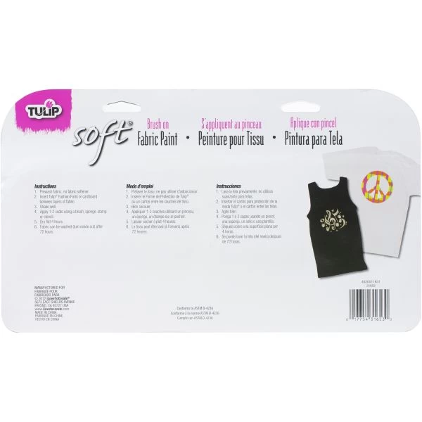 Tulip Soft Brush On Fabric Paint 1oz 10/Pkg – I LOVE TO CREATE-Tulip Soft Fabric Paint Kit. This soft fabric paint is opaque and will show up beautifully on light and dark fabrics! It is easy to brush on, and is durable and flexible. This package contains ten 1oz bottles of fabric paint. Colors: Pink, True Red, Orange, Yellow, Leaf Green, Royal Blue, Purple, Brown, Black and White. Conforms to ASTM D 4236. Imported.